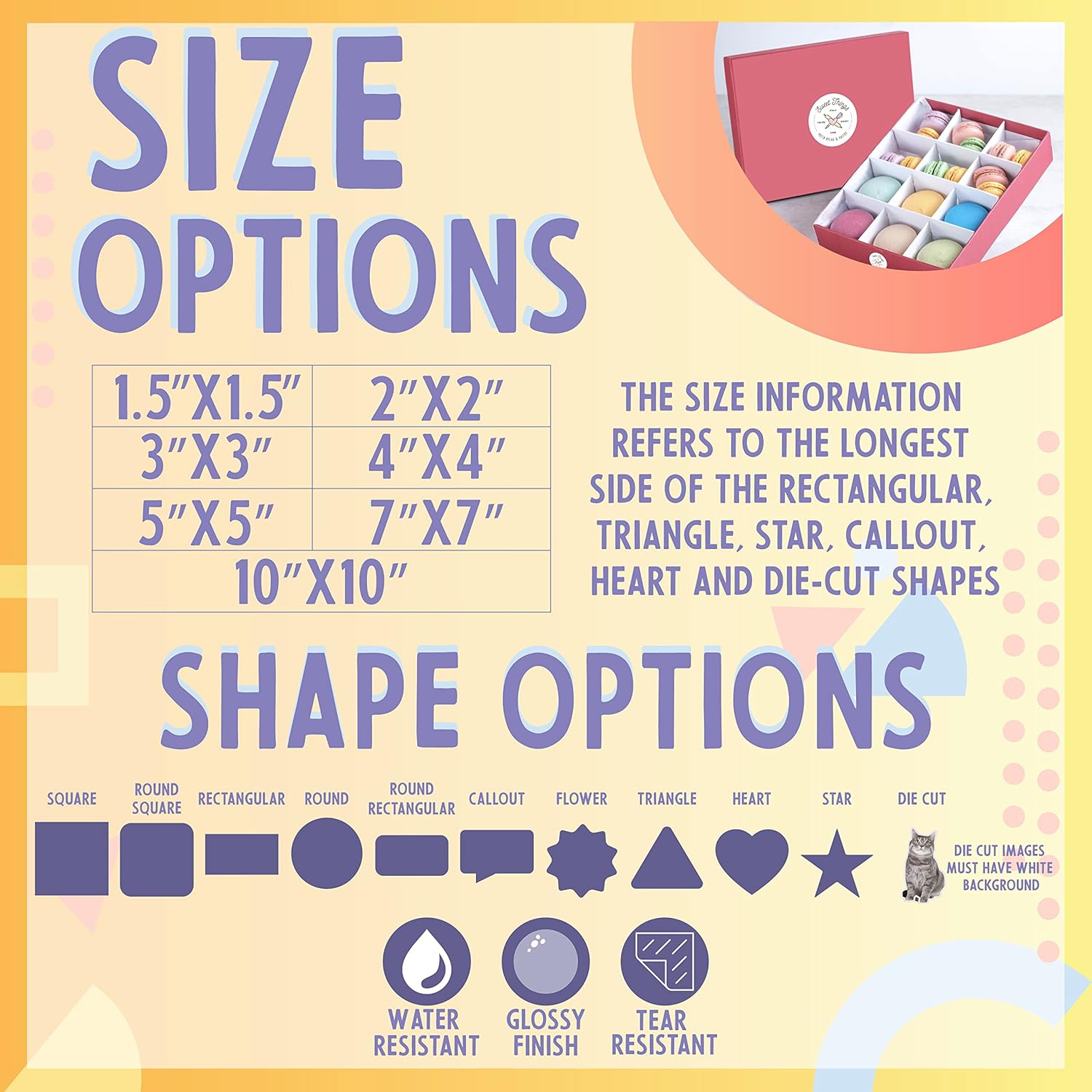 - RICH CUSTOMIZATION: 7 Size options and 11 shape options(including die cut designs) to choose from is going to fulfill your needs for labels/decals/stickers. Easy to customize and great for Small Businesses to enchance their brand recognition.